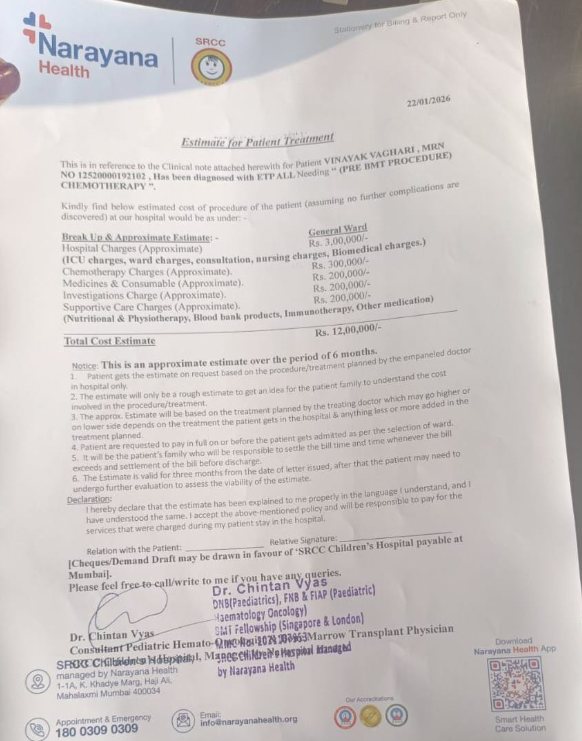 My child Vinayak Vaghar, has been diagnosed with ETP ALL (a rare and aggressive form of blood cancer). He is currently undergoing treatment at SRCC Children’s Hospital, managed by Narayana Health, Mumbai. As advised by the doctors, Vinayak urgently requires Pre-BMT chemotherapy, which is critical to save his life and prepare him for further treatment.