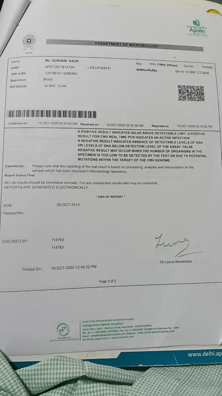 We are reaching out to you with an urgent appeal for Ms. Gurvani Kaur, an 11-year-old girl battling Thalassemia Major. Her condition is critical, and her best chance at survival is an immediate Bone Marrow Transplant (BMT), along with other essential supportive care.