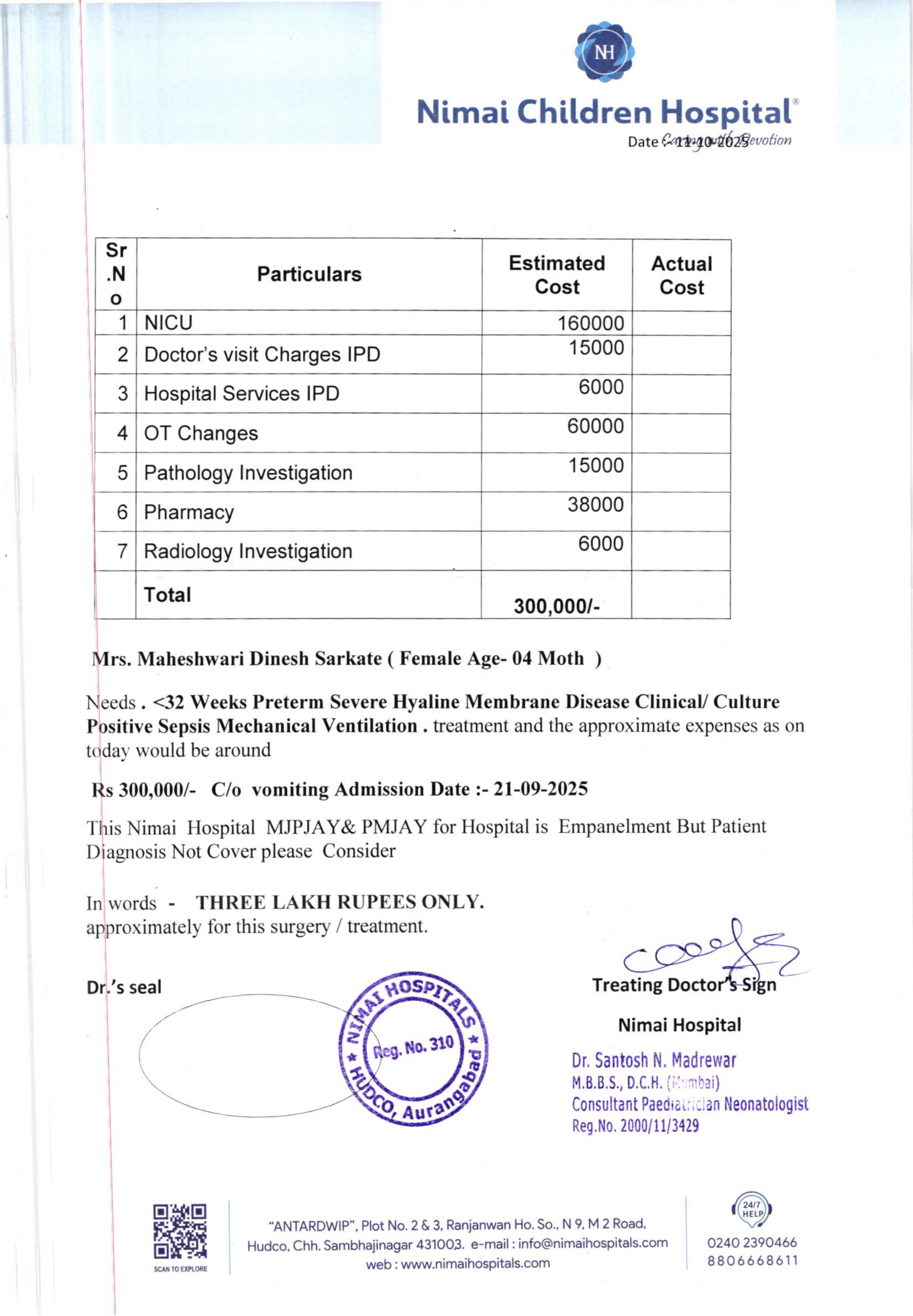 My name is Gajanan Bharatsing Jarwal, and I am in urgent need of financial help for the medical treatment of my newborn baby.My wife, Shubhangi Gajanan Jarwal, gave birth prematurely on 21st September 2025. Due to the early delivery, our baby is in a critical condition and has been admitted to NIMAI Hospital & NICU, Sambhajinagar, since birth.