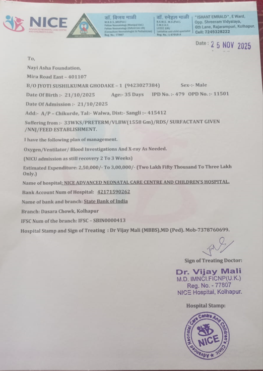 We are requesting your kind financial support for the medical treatment of Baby of Mrs. Deepali Krishna Gurav, a 23-day-old premature baby girl, who is currently undergoing intensive care at NICE Advanced Neonatal Care Centre and Children’s Hospital, Kolhapur, under the supervision of Dr. Vijay Mali (MBBS, MD Pediatrics).